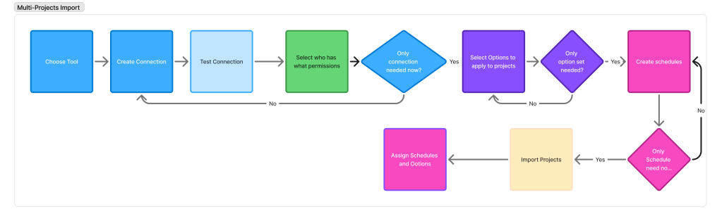Software Risk Manager created a feature for bulk tool connection, which included being able to create connections, option sets, and scheduling. It also had the ability to import projects from 3rd-party tools, which optionally could be matched to existing projects or create new projects in Software Risk Manager.
